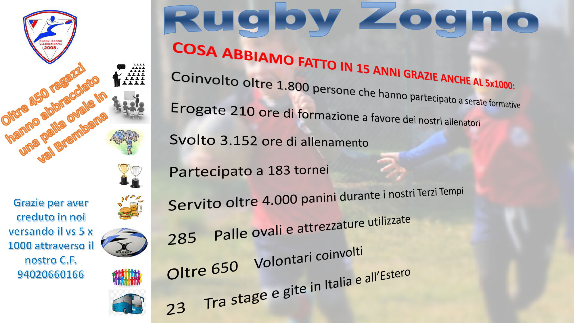 Nel Mese di Giugno 2024, c'è stato un grande evento al campo P.Polli di Zogno. Rugby Zogno Valbrembana compie 15 anni! E' stata una grade festa, dove abbiamo avuto modo di rivedere tantissimi nostri vecchi soci, tanti ragazzi che giocavano da noi! In più abbiamo avuto l'onore di ricevere la visita del nostro presidente della Federazione Italia Rugby "Marzio Innocenti" & il presidente comitato FIR Lombardia "Maurizio Vancini! & la nostra Sindaca di Zogno la sing.ra Fedi